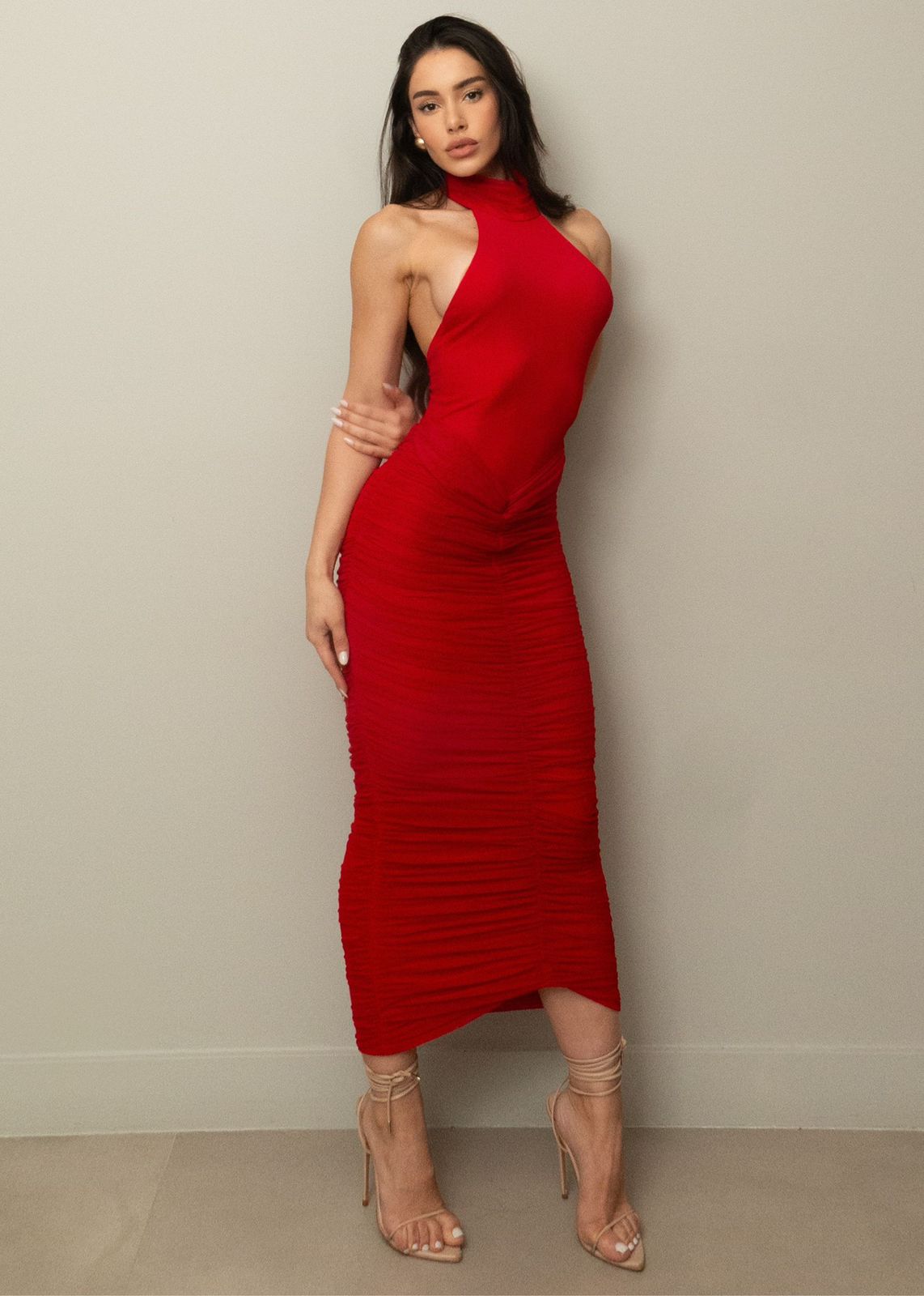 Seu design frente única e o decote alto trazem um toque moderno e refinado, enquanto as costas abertas conferem leveza e charme irresistíveis. O franzido estratégico em toda a peça valoriza a silhueta e cria um efeito visual deslumbrante, perfeito para ocasiões especiais ou eventos noturnos.