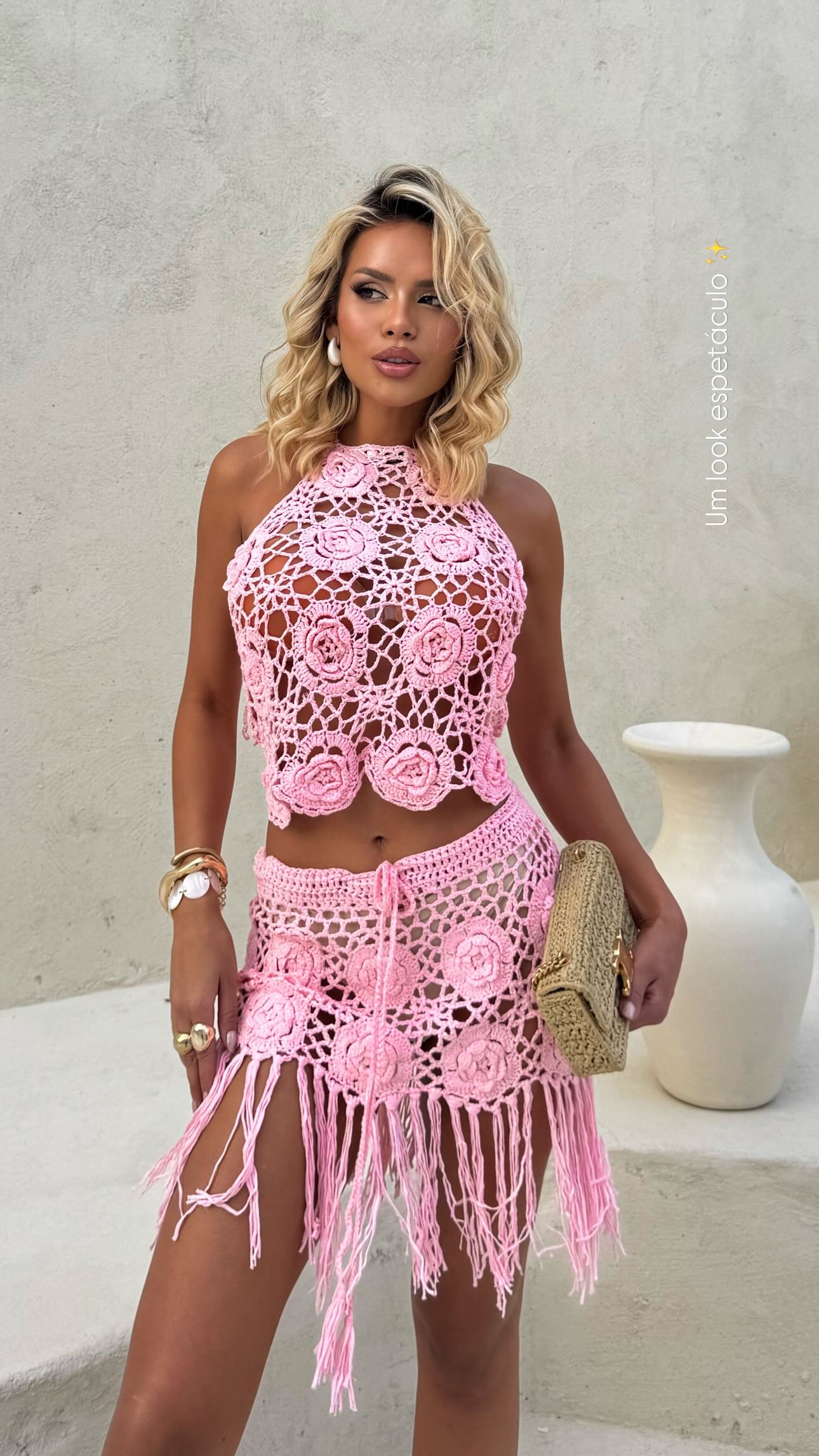 • Saia: Leve e fluida, com detalhes em franjas que adicionam movimento e elegância. Possui cordão ajustável na cintura, garantindo flexibilidade no uso.