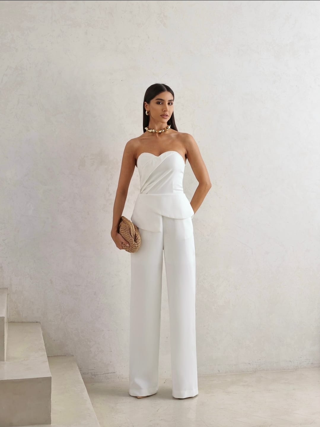 Seu decote tomara que caia em formato coração valoriza o colo com delicadeza, enquanto o detalhe drapeado na cintura cria um efeito de cintura marcada, alongando a silhueta. A modelagem reta e ampla da calça traz movimento e leveza, garantindo conforto sem perder a sofisticação.