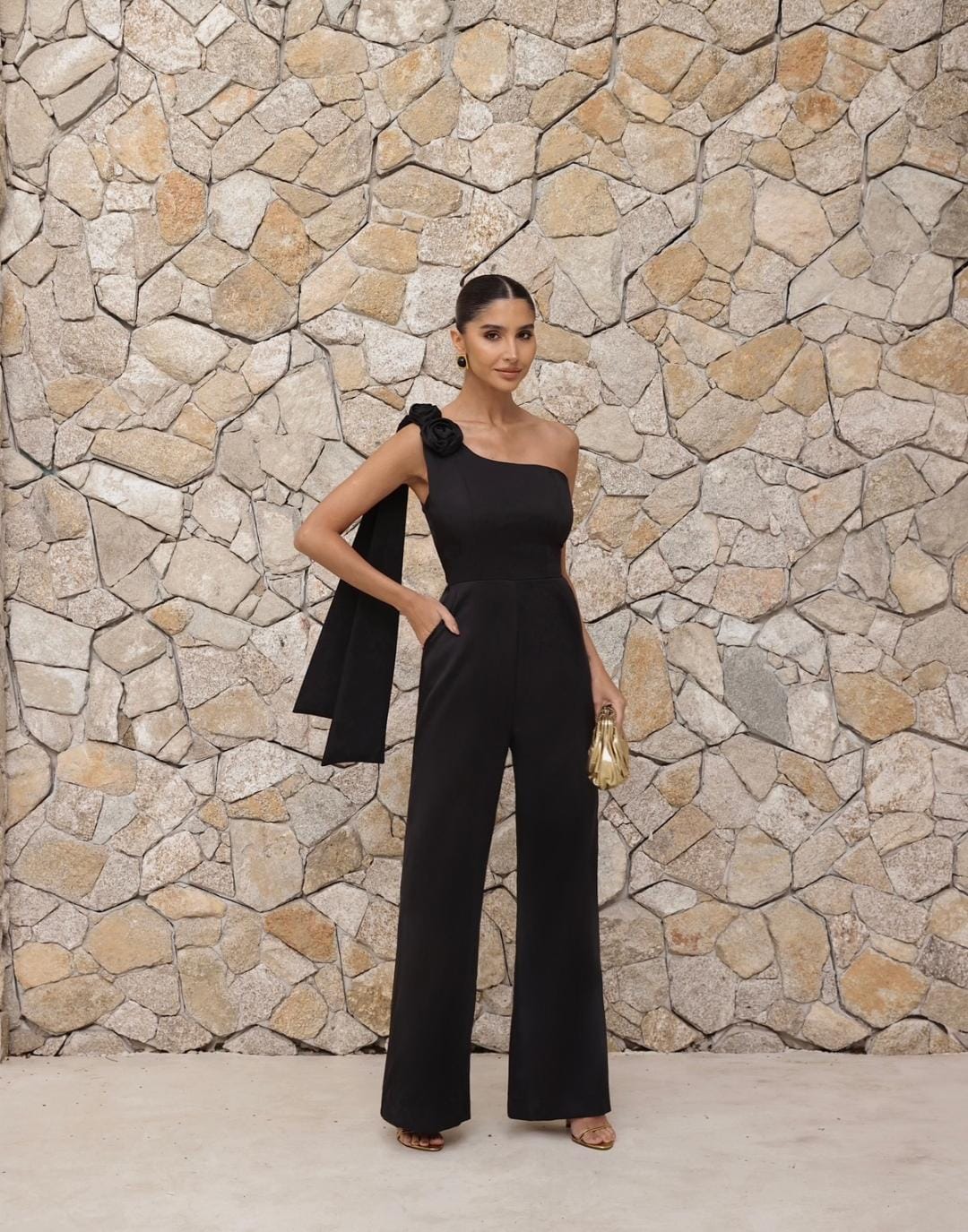 O Macacão Alfaiataria Lupita é a definição de sofisticação atemporal. Com design marcante, a peça traz um decote assimétrico de um ombro só, adornado por um aplique floral delicado que acrescenta um toque romântico e exclusivo ao visual.