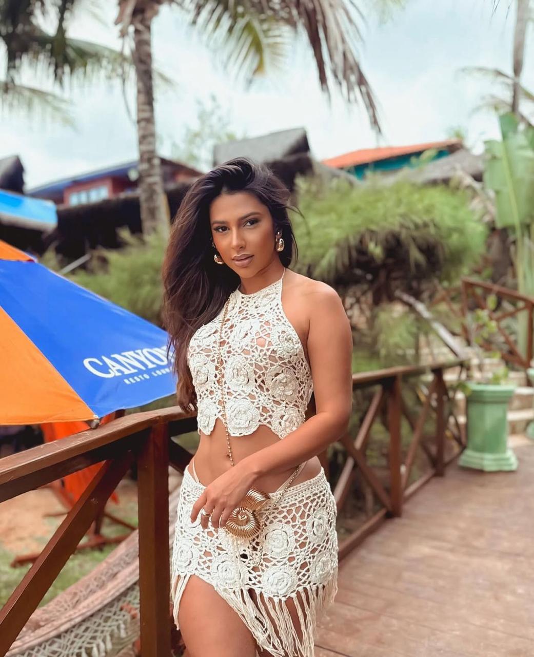 • Saia: Leve e fluida, com detalhes em franjas que adicionam movimento e elegância. Possui cordão ajustável na cintura, garantindo flexibilidade no uso.