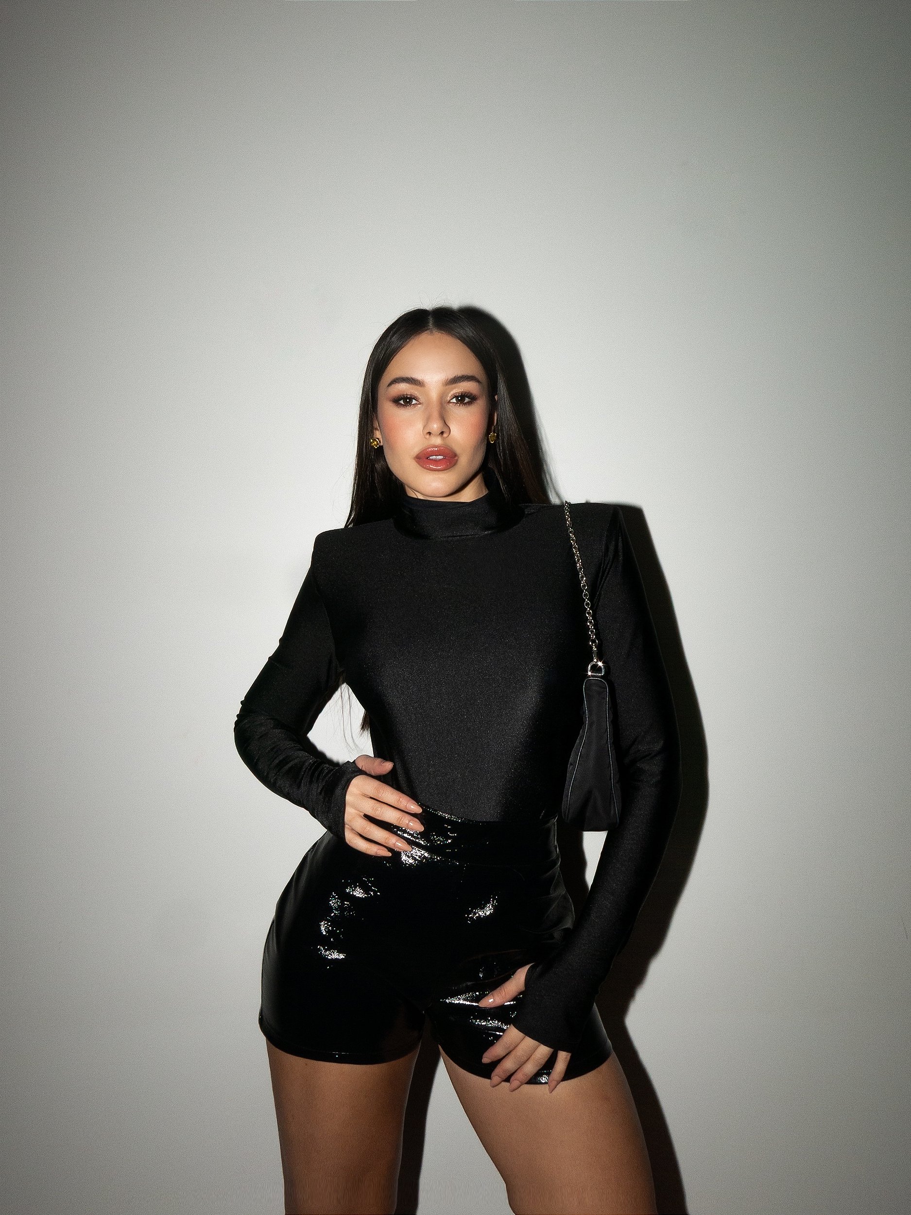 O Conjunto Alessandra combina o body estruturado com o brilho impactante do short em vinil, criando um visual moderno, sofisticado e extremamente poderoso.