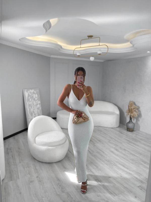 1. **Material Premium:** Fabricado com modal premium e fios de lurex, este vestido oferece uma sensação de luxo e conforto ao mesmo tempo. Seu tecido de alta qualidade proporciona uma estruturação que modela o corpo de forma elegante.